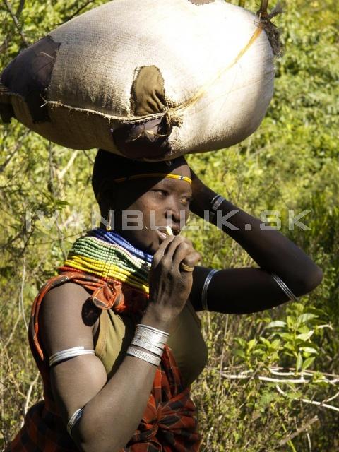 Pomaly, s rešpektom sme vstupovali malým otvorom v plote do dvora. Samuela sme obetovali – napredoval. Bolo veľké sucho už niekoľko týždňov. Veľa mužov odišlo s dobytkom za vodou veľmi ďaleko. V obydliach prebývali ženy, deti, hŕstka mužov. Ostali sme stáť za tŕnistou ohradou a Samuel odkráčal zistiť k jednému obydliu, či smieme vstúpiť – slušnosť sa má zachovávať aj v divočine. Prikývol a s napätím sme prichádzali k slameným domcom na koloch. Na zemi sedela žena s niekoľkými malými deťmi. Nakrátko ostrihané vlasy, v ušiach farebné ozdoby, na krku niekoľko radov pestrých korálov. V očiach mala nádherný, čistý pohľad. Mohla mať zo tridsať rokov, ale vyzerala oveľa staršie. Okolo nej posedávalo jej päť deťúreniec. Bez slova čistili obilie na veľkej kravskej koži. Žena sa usmiala, deti na nás vygúľali okáne. Z ďalšieho obydlia k nám zo zvedavosti pristúpila polonahá dievčina s dlhými ovisnutými prsiami, pod ktorými sa na bruchu vynímali vypálené jazvy. Okolo pása mala previazanú jednoduchú suknicu. Uši a krk jej zdobili pestré korále. Vlasy mala ostrihané nakrátko ako chlapčisko. Drobné brčky, ktoré by nikto neporátal. V rukách držala kravský trus rozrobený na kašu. Rozotierala ho po podlahe nového obydlia. Premeriavala si nás, akoby nechápala, čo sme zač.
